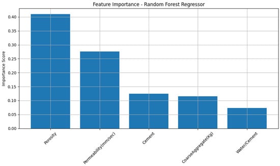 The Random Forest model indicated that Porosity and Permeability were the most influential features, followed by Cement content, Coarse Aggregate, and Water/Cement ratio as shown in