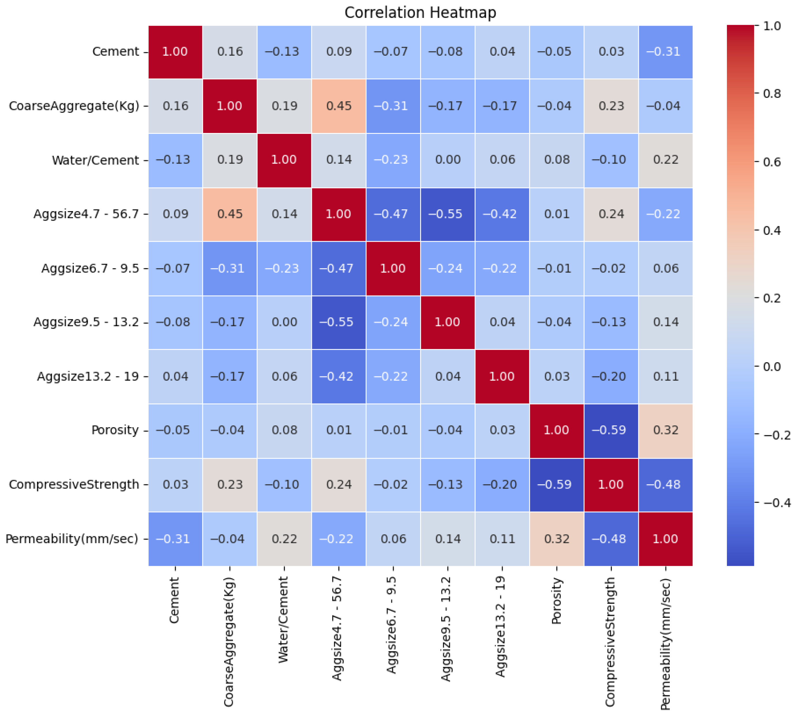Figure 1 illustrates the correlation structure among all numerical features prior to feature removal. Compressive strength shows a moderate negative correlation with porosity and a weak negative correlation with the water–cement ratio, both consistent with established material behavior. Permeability exhibits a weak positive association with porosity, reflecting the influence of interconnected voids on infiltration capacity. In contrast, the aggregate size variables display consistently low correlation with compressive strength and high inter-correlation among themselves, indicating redundancy and limited predictive value. Therefore, aggregate size features were removed to simplify the dataset and improve model clarity and generalization.Pearson correlation was used for this analysis, as it is the default method in Pandas and is appropriate for assessing linear relationships among continuous numerical variables.