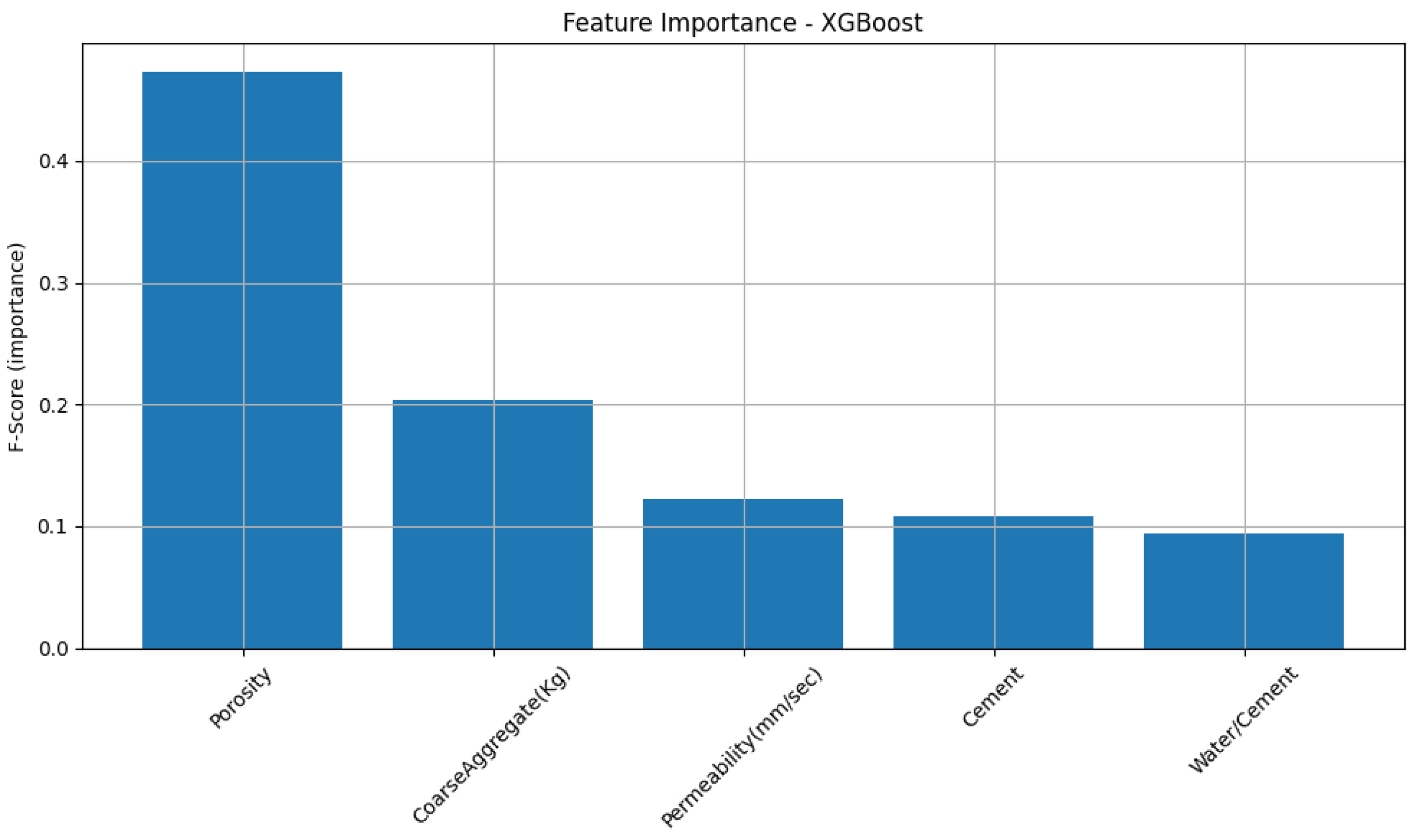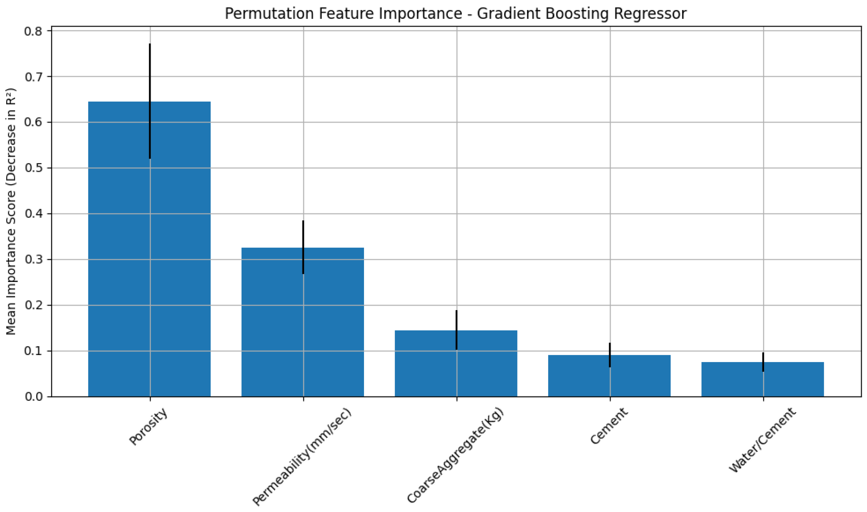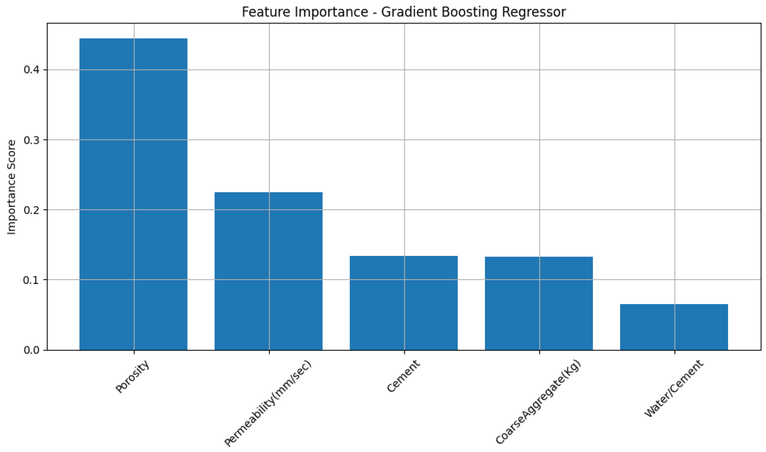 The Gradient Boosting model revealed Porosity as the most dominant factor, contributing over 40% to the prediction. Permeability, Cement content, and Coarse Aggregate followed, while Water/Cement ratio showed the least influence as shown in