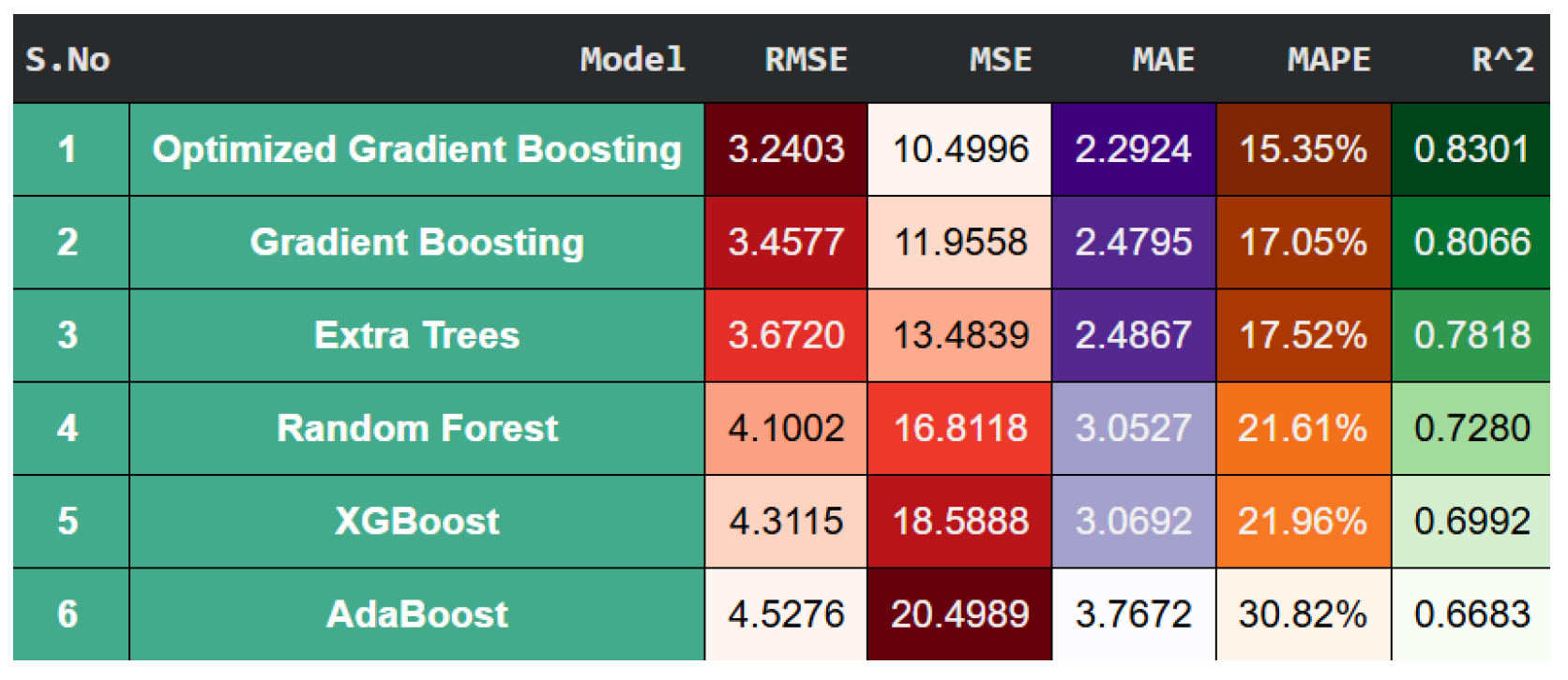 Model performance comparison across ensemble regressors using RMSE, MAE, MAPE, and metrics. The Optimized Gradient Boosting model achieved the best overall performance, with the lowest error values and highest , indicating improved predictive reliability over other models.