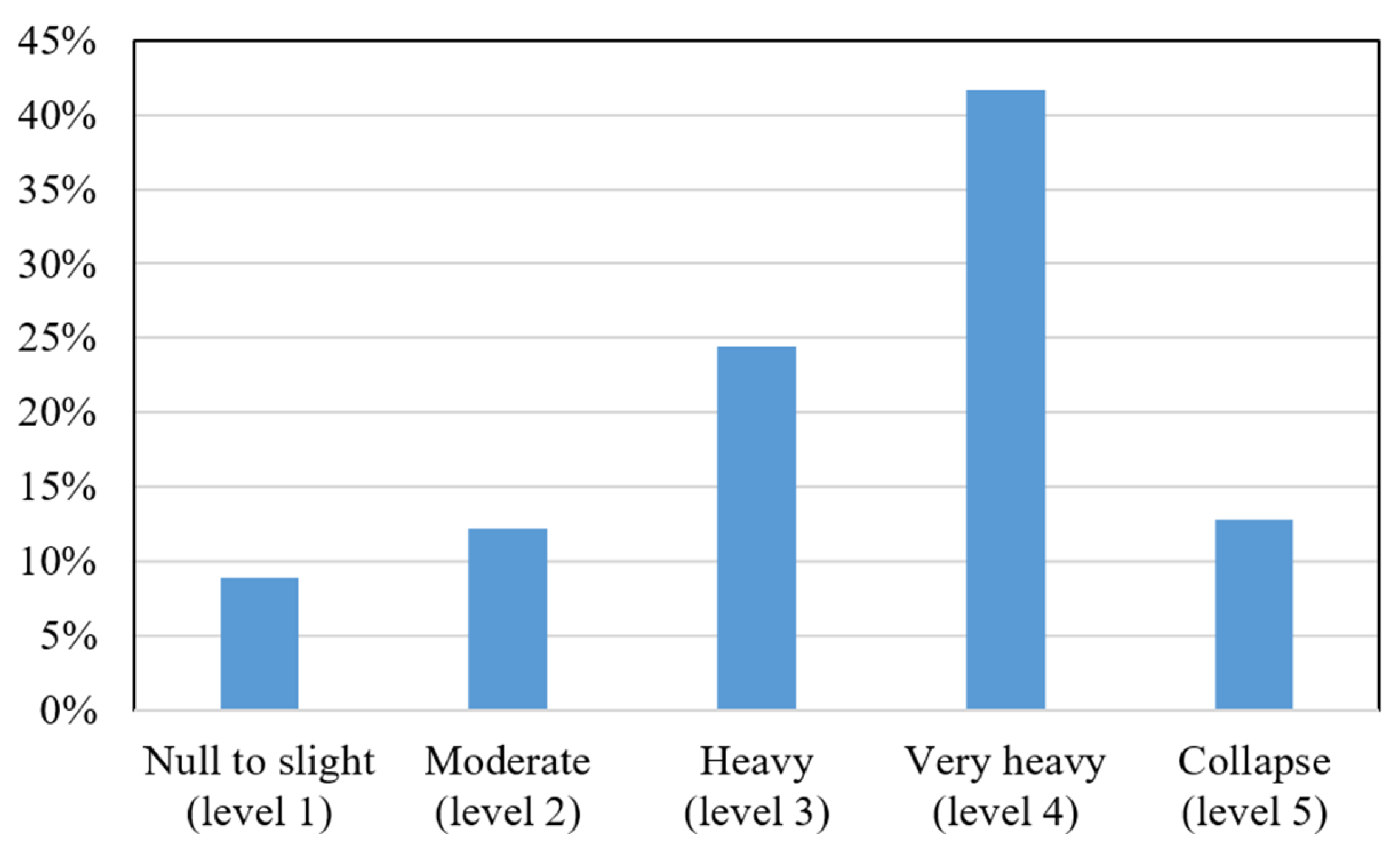 | Damage Level | Null to Slight (Level 1) | Moderate (Level 2) | Heavy (Level 3) | Very Heavy (Level 4) | Collapse (Level 5) |