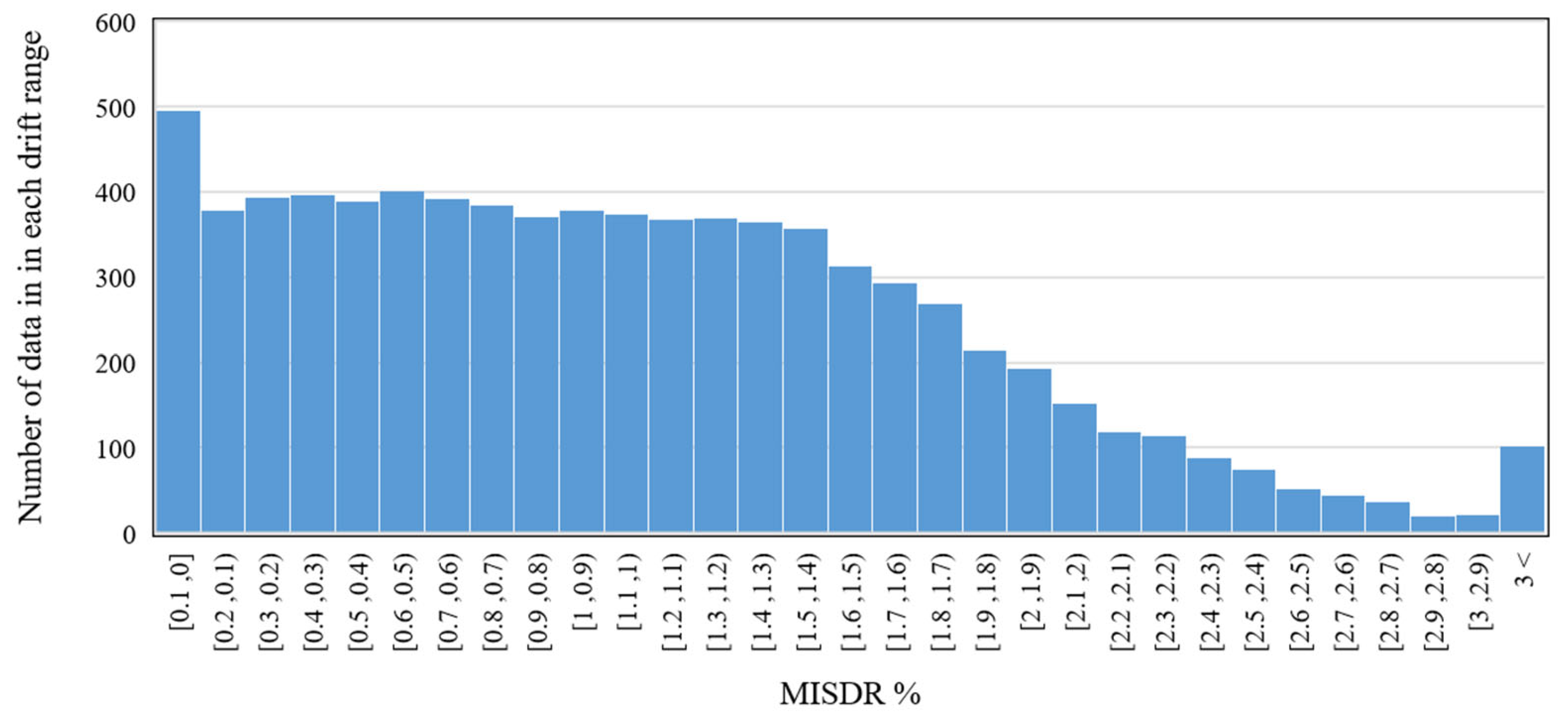 Figure 4 shows the histogram of the dataset produced after conducting the time-history analysis. The data are approximately uniformly distributed for MISDR values between 0.1% and 1.5%. Beyond MISDR = 1.5%, the density of data decreases, reflecting the lower probability of very strong seismic events. Consequently, the number of cases exhibiting severe damage declines in the dataset.