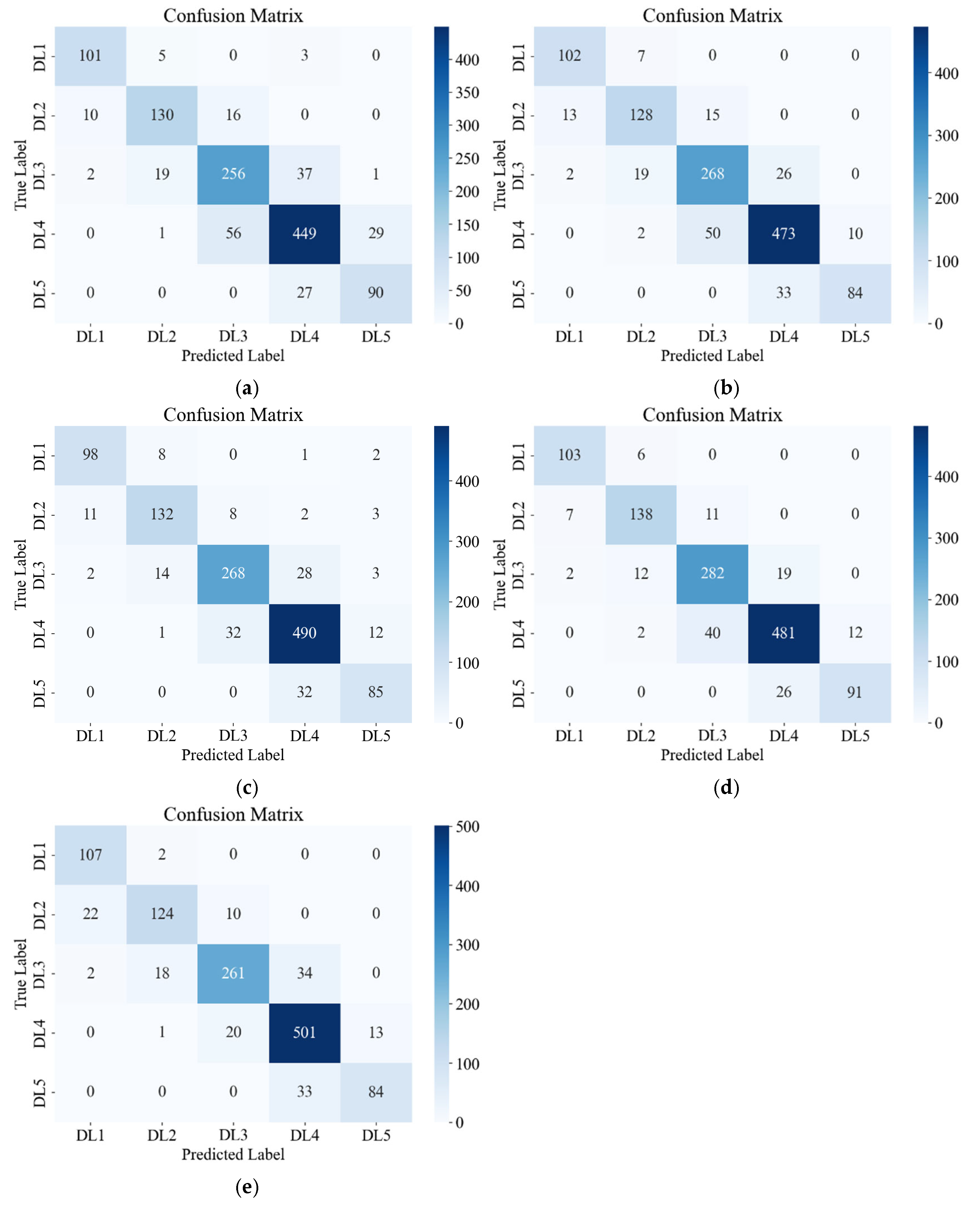 Examination of the confusion matrices showed that most misclassifications occurred between adjacent damage levels, particularly between DL3 and DL4. This pattern is expected because structural damage evolves continuously rather than in discrete steps, and the boundary between moderate and severe damage is often ambiguous. Misclassification in the collapse category (DL5) stems mainly from the limited number of high-intensity samples and the inherent uncertainty of extreme responses in nonlinear dynamic analyses [