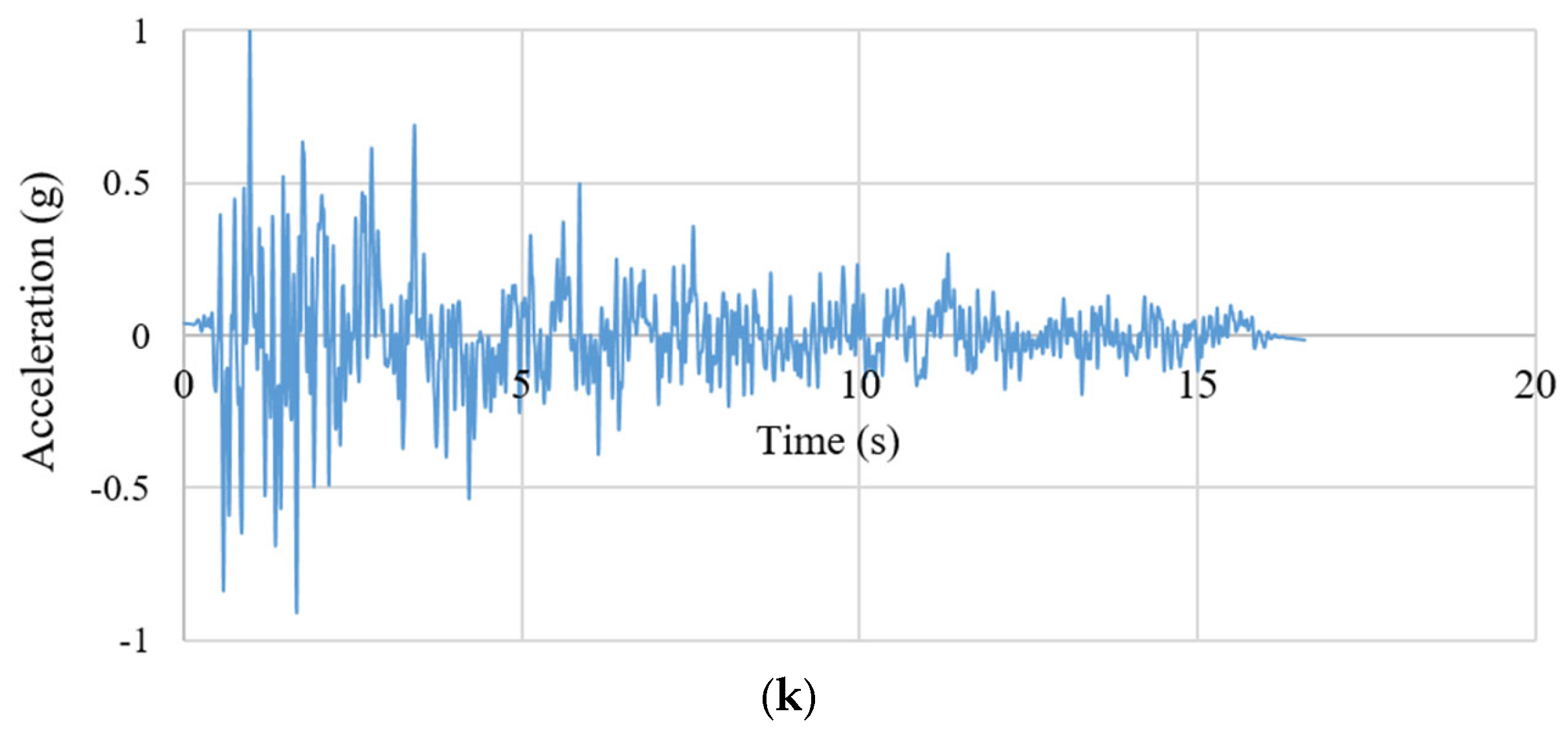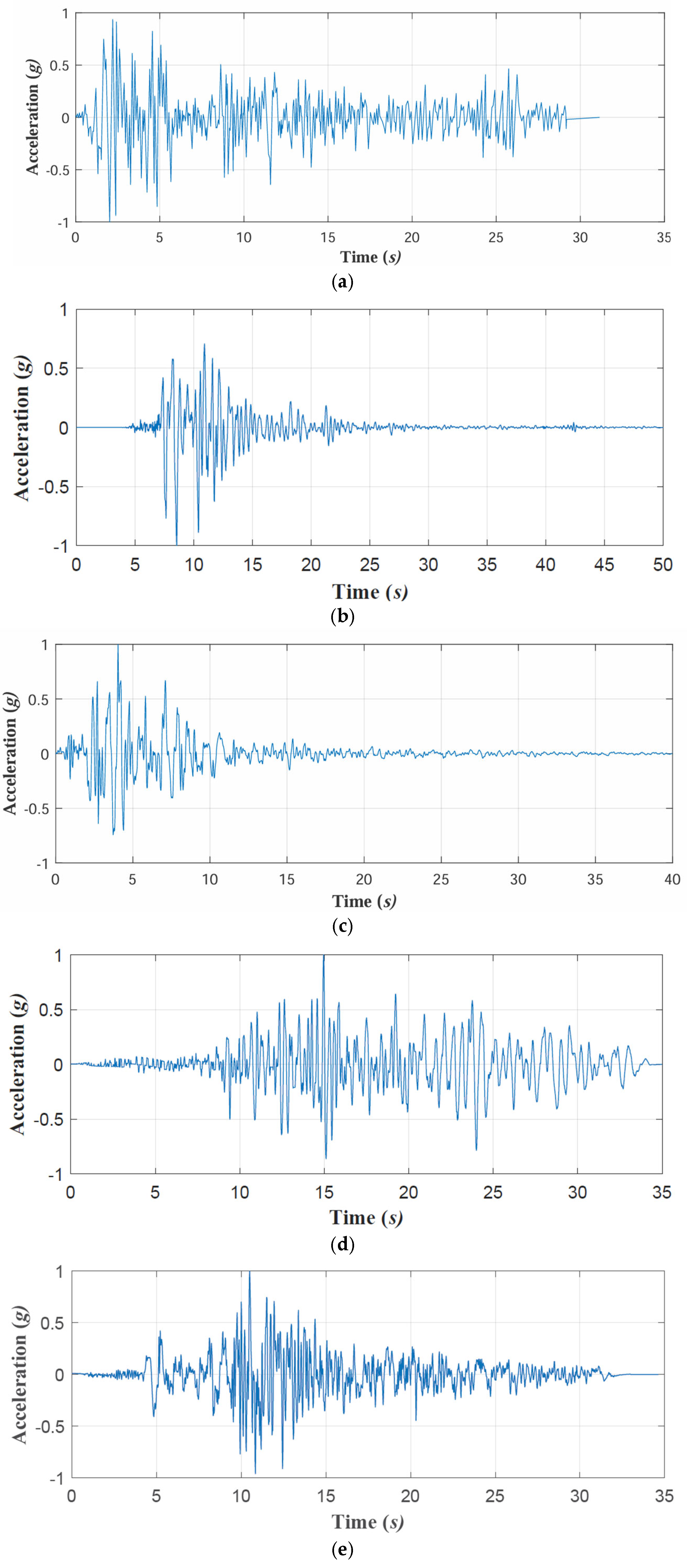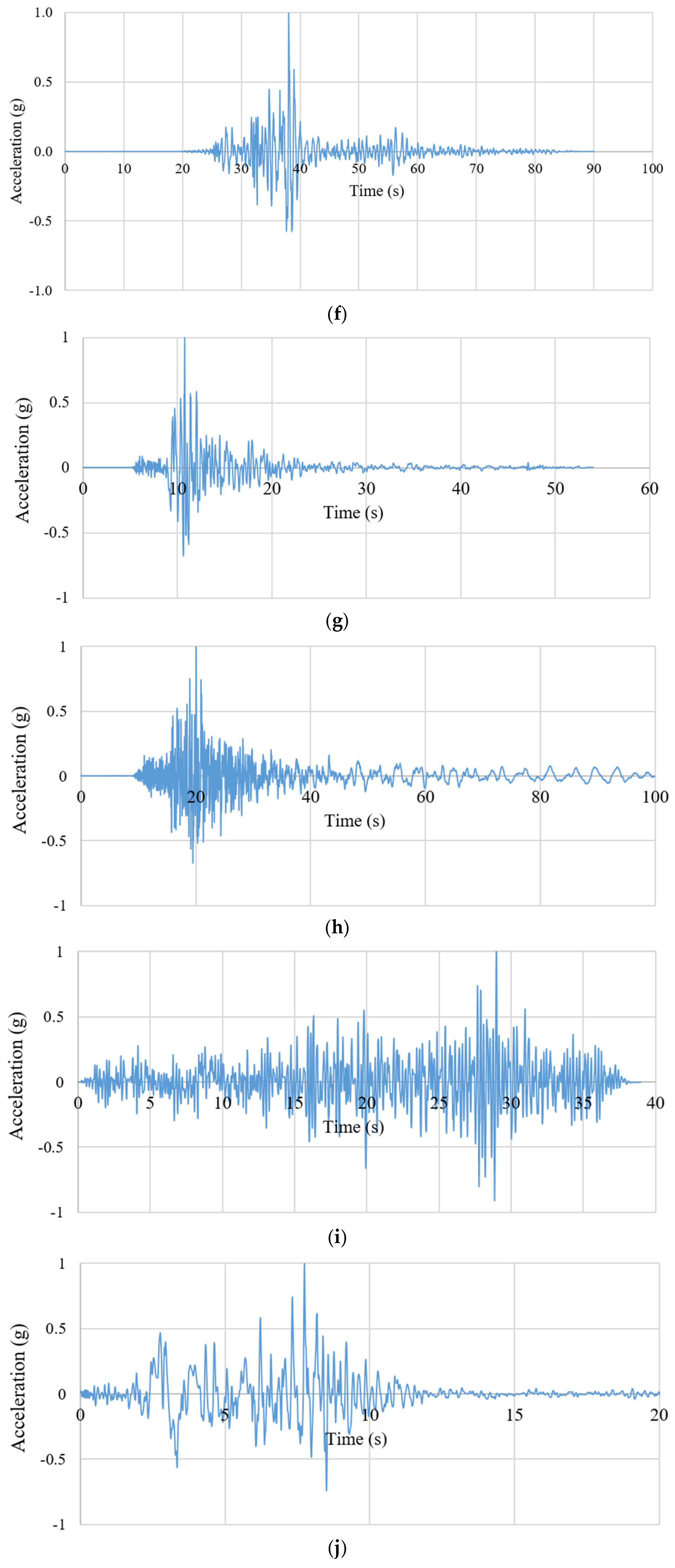 Eleven seismic events were selected for the time-history analysis. The acceleration history of each seismic event is presented in