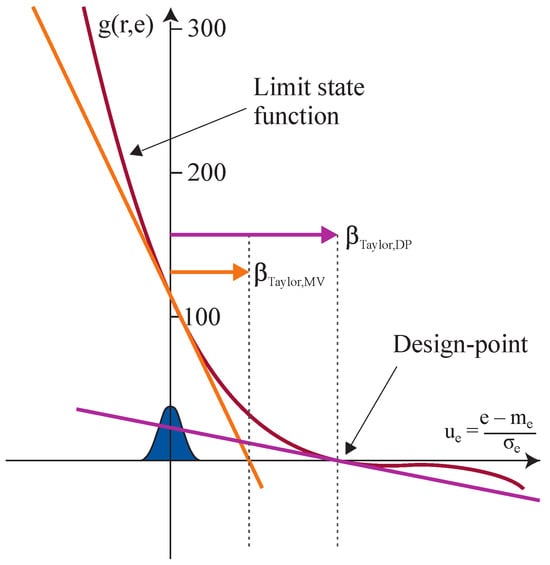 The challenges around the MVFOSM formulation are symbolically illustrated in Figure 1 for the simple case representing the basic variables and in which = − − 2 (see assumptions for the basic variables in Table 4). As explained, the Taylor approximation in the MVFOSM method is at the mean value, which is the origin in the standard normal space. Alternatively, when using an A-FORM (in this case, the algorithm of Hasofer and Lind [37] was also utilized), the Taylor approximation is at the so-called “design-point” (see Section 3). As observed in Figure 1, the approximation at the mean value introduces an integration error, which can be expressive in dependency of the curvature of the function. In this case, the determined with an MVFOSM is smaller than the computed with an A-FORM method, thereby potentially leading to more conservative design solutions. Note, however, that a distinct limit state function with a different curvature may change the trend of the estimated structural reliability level.