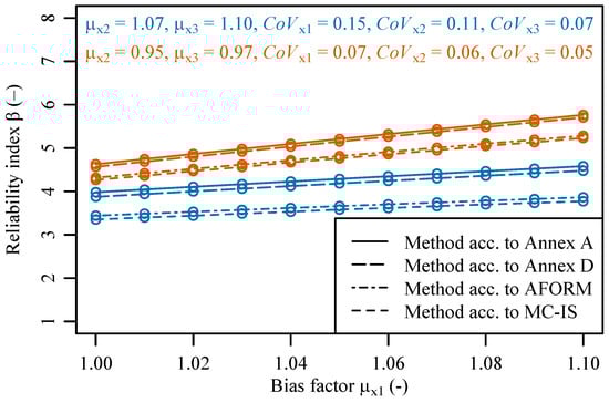 Sensitivity analysis for the bias factors of the basic variable on the reliability indices determined according to different methods (blue curve corresponds to numerical example 1, and the orange curve corresponds to numerical example 2).