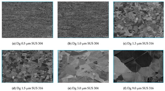 SUS 304 and 316 thin metal foils with different sizes of Dg (as received). (a) Dg 0.5 μm SUS 304; (b) Dg 1.0 μm SUS 304; (c) Dg 1.3 μm SUS 316; (d) Dg 1.5 μm SUS 316; (e) Dg 3.0 μm SUS 304; (f) Dg 9.0 μm SUS 316.