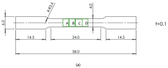 The entire dimension shown in Figure 2a is in millimeters. Based on Figure 2a, the surface roughness behavior is investigated in points A, B, C, and D. The purpose of measuring the surface roughness in various areas is to compare the surface roughness behavior in thin metal foils because of plastic deformation and its mechanism. The thin metal foils shown in Figure 2a are of commercial SUS 304 and SUS 316 with a 4.0 mm width, 0.1 mm thickness, and 20.0 mm gauge length. The standard used is DIN 50125. The sample made of the dog bone type is shown in Figure 2a.
