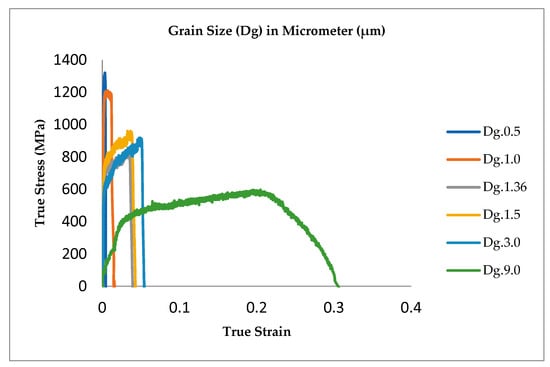 Figure 3 shows the true stress–strain curve of the thin metal foils SUS 304 and SUS 316 with various sizes of Dg. When the Dg increases, the fracture strain of the metal foils increases. When the Dg increases, the strength of the thin metal foils of SUS 304 decrease. A low fracture strain and low tensile strength are obtained in the thin metal foils of SUS 316 with a fine grain. Different fracture strains and tensile strengths of the thin metal foils may affect the surface roughness in SUS 304 thin metal foils.