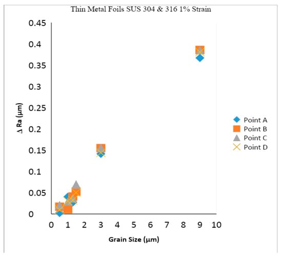 The factor that affected the yield stress of the thin metal foils SUS 304 and 316 was the loading direction, which depends on the orientation of the grain. Hence, besides Dg, surface roughening and the inhomogeneous yield also depend on the grain orientation and distribution. As shown in Figure 3, thin foil materials have a higher ductility for coarse grain, which indicates a higher fracture strain, compared to fine grain. As shown in Figure 3, fine-grain thin metal foils have a lower fracture strain. Furthermore, for fine-grain SUS 304, the strength and yield point are higher, compared to coarse grain, and are in good agreement with the Hall–Petch equation. Fracture strain and tensile strength may affect surface roughening with various sizes of Dg. Based on Figure 4, the surface roughness increase is higher for coarse-grain SUS 304, compared to fine-grain SUS 304 and SUS 316 thin foils, which is due to the ductility and grain share of the coarse Dg being higher, compared to that of the fine Dg. Furthermore, when the grain is larger, the grain surface increases. When the grain surface increases, the flow stress decreases, along with the ductility. The consequences are that the dislocation density and flow stress are lower for coarse Dg, compared to fine Dg [23,31,32,33,34,35]. The increasing surface roughness at points A, B, C, and D in fine grain is similar. The increase of surface roughness in points A, B, C, and D for coarse grain are nearly the same. This means that the surface roughness behaviors are the same in the whole area of the gauge length because of the same fracture strain at points A, B, C, and D. Finally, the increase of the surface roughness in the entire area at points A, B, C, and D is the same.