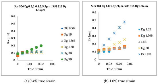 Surface roughening (Ra) behavior of thin metal foils SUS 304 and SUS 316. (a) 0.4% true strain; (b) 1.0% true strain.