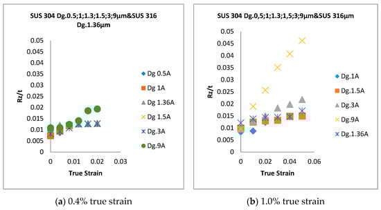 Rz/t behavior of thin metal foils SUS 304 and SUS 316. (a) 0.4% true strain; (b) 1.0% true strain.
