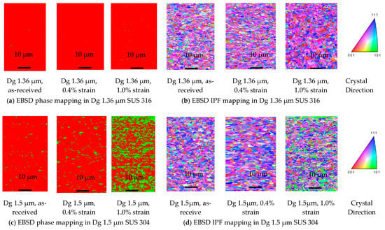 SEM-EBSD Mapping for SUS 304 and SUS 316 thin metal foils. (a) EBSD phase mapping in Dg 1.36 μm SUS 316; (b) EBSD IPF Mapping in Dg 1.36 μm SUS 316; (c) EBSD phase mapping in Dg 1.5 μm SUS 304; (d) EBSD IPF mapping in Dg 1.5 μm SUS 304; (e) EBSD phase mapping in Dg 9.0 μm SUS 304; (f) EBSD IPF mapping in Dg 9.0 μm SUS 304.