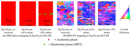 The grain deformation in the coarse-grain SUS 304 is larger than that in the fine-grain, and a more severe grain deformation occurs in coarse grain, as shown in Figure 7f, compared to fine grain. This result is the reason for the higher increase in surface roughness in coarse grain, compared to fine grain. Furthermore, the surface roughness increases proportionally with the same strain level in coarse grain, unlike in fine grain, during the uniaxial tensile stress state. Based on the EBSD results, the MPT in coarse grain is lower than that in fine grain. Thus, the grain strength is lower, compared to that in fine grain, and the surface roughness becomes higher, because coarse grain is easier to deform.