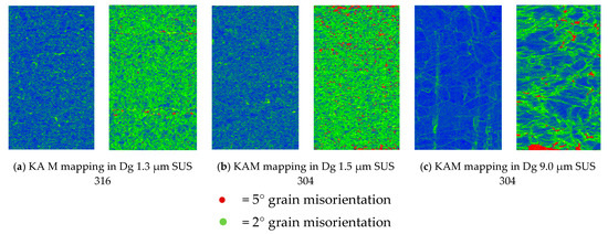Kernel average misorientation (KAM) mapping for SUS 304 and SUS 316 thin metal foils. (a) KAM mapping in Dg 1.3 μm SUS 316; (b) KAM mapping in Dg 1.5 μm SUS 304; (c) KAM mapping in Dg 9.0 μm SUS 304.