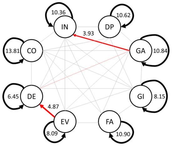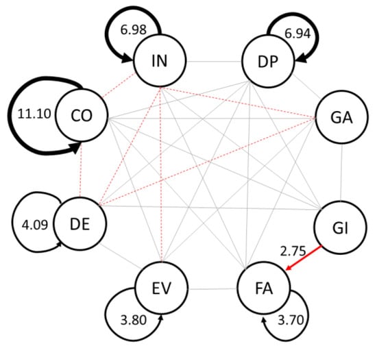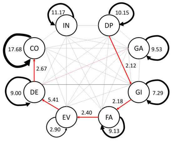 Figure 2 shows a sequential diagram of the students’ engineering design behaviors. As shown, 13 significant behavior sequences existed in the PD experimental group, which included eight self-iterations, namely, identifying needs ((IN)→IN, DP→DP), gathering information ((GA)→GA, GI→GI, FA→FA), evaluation ((EV)→EV), decisions ((DE)→DE), communication ((CO)→CO), and five sequential behavior transfers from DP→GI, GI→FA, FA→EV, EV→DE, and DE→CO. A sequential behavior transfer from GA→DE was absent.