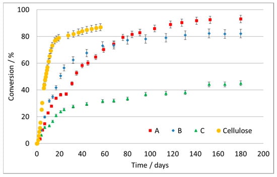 Three replicates were collected simultaneously for each sample under the same conditions. Testing was suspended after 180 days according to the norm prescriptions, even if incomplete conversion was achieved. The material was inspected after testing. Apparently, there were no significant residuals in the case of materials A, B and cellulose. Some residual grains were detected for material C, with surface deterioration, opacisation and striction.