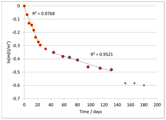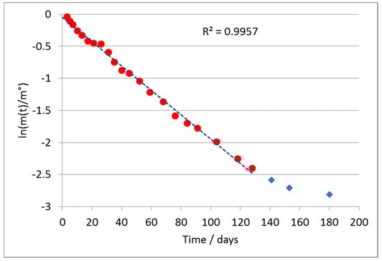 The absolute value of the slope of the line directly provides the value of the kinetic constant k, according to Equation (4). It was calculated as a value of k = 0.0204 ± 0.0010 days−1.