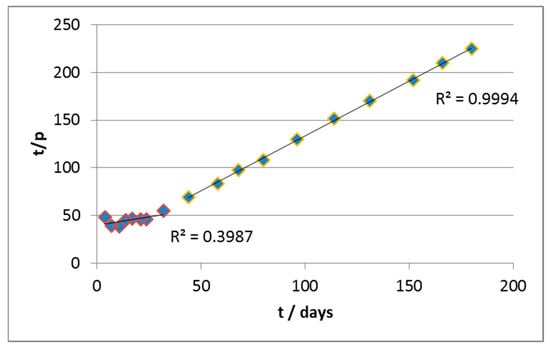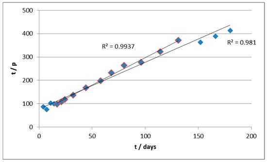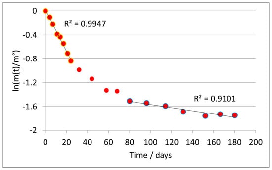 The same approach was used for data elaboration. In this case, the initial rate of biodegradation was very high, but after approximately 25 days, it underwent an abrupt slowdown, until it became negligible. The application of the same criteria of data-reprocessing throughout the whole experimental field has, however, produced a curve instead of a line, as shown in Figure 3.