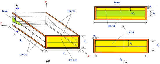 The 3-D beam geometry of the helicopter rotor blade consists of different composite laminates and their arrangements have been shown in Figure 2. The beam of size is made of three distinct types of composite: unidirectional glass/epoxy (UD G/E), unidirectional ±45° carbon/epoxy (UD C/E), and isotropic foam. The elastic bulk properties of orthotropic UD G/E composite, orthotropic UD C/E composite, and isotropic foam material are collected from [33,34,35,36] and presented in Table 1. In the FE model, the helicopter blade has been idealized as a cantilever beam which is fixed in the root section, and correspondingly all displacements components are constrained as shown in Figure 2a. In the free end (tip), normal compressive pressure , uniform shear traction along y direction , and uniform shear traction along z direction have been applied.