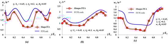 Free end (tip) deformation components and stress fields are the critical design factors in helicopter rotor blade. For the simulation, normal compressive pressure MPa, uniform shear traction along y direction MPa, and uniform shear traction along z direction MPa have been considered at the tip of the rotor. From the FE model, displacement components and stress–strain field at any given cross-section or point of the rotor blade can be obtained. In order to validate the FE framework, numerical results from FE model have been compared with the results from Abaqus FEA [39] for both displacement and stress-field at the tip of the rotor. The distribution of different parts of displacement fields along y at for applied traction , along x at for applied traction , and along y at for applied traction at the tip of the blade (i.e., ) have been considered and compared between Abaqus FEA and the FE model for specific set of parameters , , and as shown in Figure 4. Here , , and are the elemental deformation components and , , and are the average deformation components [18,19] at the tip cross-sectional area of the rotor along x, y, and z axis, respectively. The distribution of from FE model has the maximum value at the interface of UD C/E and UD G/E laminates (i.e., and ) as shown in Figure 4a. The deformation is relatively high in the UD C/E laminate, whereas the distribution of is relatively low in UD G/E region. This is due to UD G/E laminate has higher stiffness along x -axis compared to UD C/E. Similarly, is significantly high in UD C/E laminate compare to UD C/E and there is a sudden jump in distribution at the interface as shown in Figure 4b. On the other hand, has maximum value at and it increases monotonically in UD G/E region (i.e., ) as shown in Figure 4c. Comparison between Abaqus FEA and FE model indicates good resemblance of displacement fields at the tip of the blade with maximum deviation. Although, numerical result from FE model reveals that FE model overestimates the Abaqus FEA at the tip of the rotor; however, qualitative distribution of deformation fields are quite similar.
