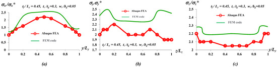 Distribution and comparison of different parts of stress fields between the numerical results of Abaqus FEA and FE model for (a) along y at for applied traction ; (b) along x at for applied traction ; (c) along y at for applied traction MPa at the tip of the blade(i.e., ) for , , and .
