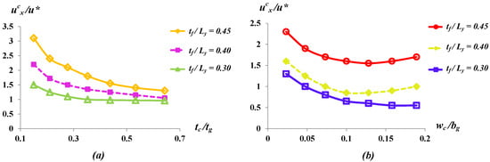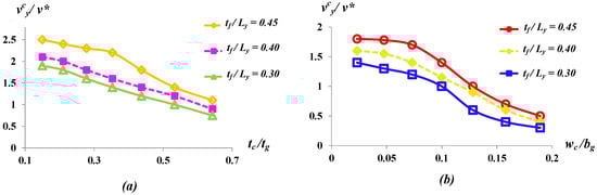 In this section, the effect of and which characterizes the overall geometry of the rotor blade on the deformation behavior of the rotor tip has been studied to understand the efficient geometric configurations and arrangements of composite laminates of the rotor blade system. For the study, three different , , and have been considered which characterize the foam thickness at the fixed end of the composite. For the study, two main dimensionless deformation parameters and have been defined which characterize the overall tip deformation behavior of rotor blade. Here, and are the deformation components at the centriod of the tip cross section; and are the average deformation components [18,19] at the tip cross-sectional area of the rotor along x and y axis, respectively.