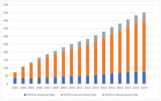 where DOC is the fraction of degradable organic carbon in bulk waste in Gg of C/Gg of waste given by Equation (3), that considers DOCi as the fraction of DOC in waste type i; and Wi as the fraction of waste type i. The Decomposable Degradable Organic Carbon (DDOCm) is defined by Equation (4), considering W as the waste mass deposited in Gg; DOC as the degradable organic carbon in the year of deposition Gg of C/Gg of waste in fraction; DOCf as the DOC fraction that can be decomposed in fraction (recommended default value 0.5 considering that SWDS environment is anaerobic and DOC values include lignin); and MCF as the CH4 correction factor in aerobic conditions in the year of deposition in fraction (default values provided by IPCC for SWDS managed in anaerobic conditions and unmanaged in less than 5 m of high are 1 and 0.4, respectively) [12,14].