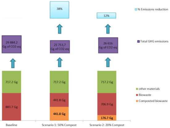 After GHG emissions calculation, the GHG reduction potential can be determined by the Equation (18), being ESWDS and Ecomposting_process the total emissions from biowaste in SWDS and in composting plants respectively in Gg of CO2-eq; and Ereduction the total gas reduction for the composting process in Gg of CO2-eq.