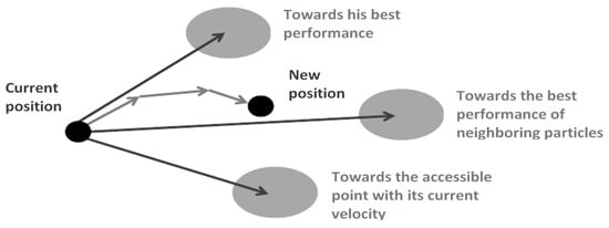 16]. During the flight, each particle updates its velocity vector, based on its momentum and the influence of its best position (