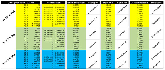 Table 5. The table contains the values of the RMSE, mean absolute error (MAE), number of epochs, CPU times, and the prediction accuracies. It is clear that the prediction performance of CSNN is better than that of PSO-ANN and BPNN, with the exception of certain prediction values mentioned above. In the case of ortho-polyester, the maximum RMSE at 20 °C dry reaches 0.0373 for BPNN, 0.0374 for PSO-ANN and 0.0387 for CSNN. At 20 °C dry in the case of iso-polyester, the maximum RMSE is about 0.299 for BPNN, 0.288 for PSO-ANN and 0.041 for CSNN. As for the case of vinyl ester (Derakane 411C-50), the maximum error reaches at 50 °C wet 0.112 for BPNN, 0.064 for PSO- ANN and 0.042 for CSNN. At the same time, the max RMSE at 20 °C wet of the vinyl ester (Derakane 8084) is 0.155 for BPNN, 0.139 for PSO-ANN and 0.128 for CSNN. In the same table, we can note that the lowest number of epochs corresponds to the CSNN combination, with the shortest calculation times and best prediction accuracies. Both BPNN and PSO-ANN have higher RMSE values than CSNN. The CSNN approach gives better results than PSO-ANN due to its simplicity in using mathematical models. Additionally, CSNN adjusts the weights without determining a gradient, as is the case with BPNN. We found that CSNN converged faster to a minimum error in the training process, whereas PSO-ANN requires a considerable number of iterations.