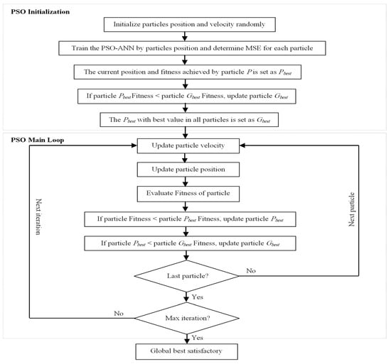 20]. The number of PSO dimensions is taken as the total number of neural network weights and biases. The PSO-ANN combination procedure is illustrated in the flowchart of