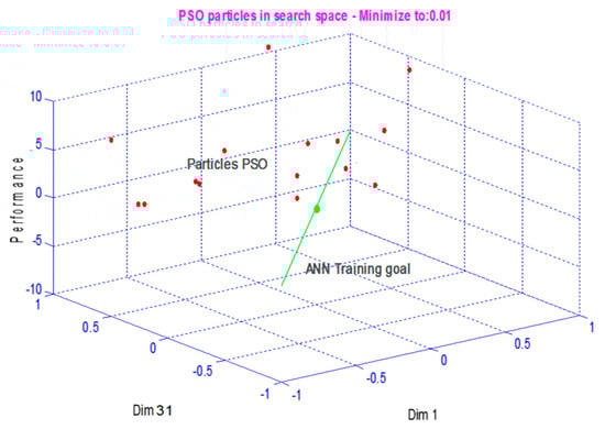 A neural network optimized by a particle swarm algorithm is also called a PSO-ANN (particle swarm optimization-based artificial neural network) combination. This algorithm takes the weights and biases of the trained neural network as a single particle. For training a neural network using the PSO, the fitness value of each swarm particle (member) is the value of the error function evaluated at the particle’s current position, and the particle’s position vector corresponds to the network’s weight matrix [