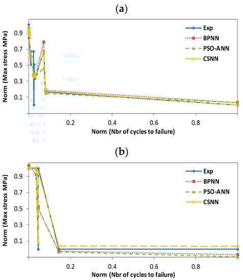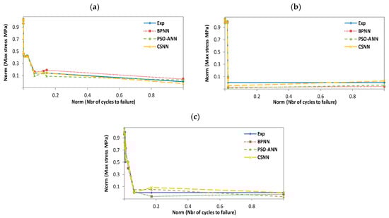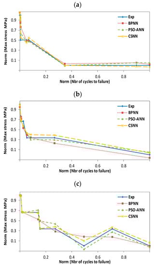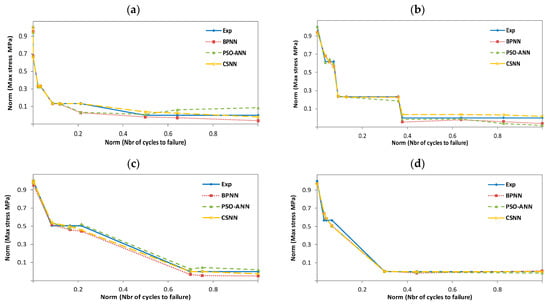 N). For illustration and comparative purposes, we have presented in the same figure and for each studied temperature, four plots for different experimental and predicted values obtained with BPNN, PSO-ANN, and CSNN, where they show typical fatigue life predictions. We did not have enough data to predict scenarios for 50 °C wet conditions. All the data originates from SNL, who performed the experiments and made their database publicly available. Therefore, we have not being able to test the 50 °C wet with the following materials: Derakane 8084, CoRezyn 75-AQ-010 and Derakane 411C-50.