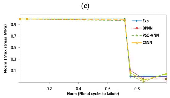 Table 1) in terms of fatigue lives and hygrothermal effect. The size of the database collected is 122 sets distributed over the four resins in question (ortho-polyester, iso-polyester, vinyl ester 411C-50 and vinyl ester 8084). Before we began to model the data, we had to normalize it to be in a range from 0 to 1. Since the number of cycles to failure ranged from 16 to 6,000,000 cycles, and the maximum applied compressive stress was −13.8 to −41.4 MPa, we used the range-normalized absolute difference method based on the Equation (8):