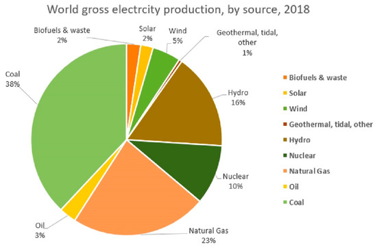 - International Energy Agency (IEA). World Gross Electricity Production, by Source. 2018. Available online: https://www.iea.org/data-and-statistics/charts/world-gross-electricity-production-by-source-2018 (accessed on 27 April 2021).