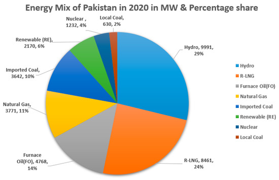 Pakistan signed the Kyoto Protocol and Paris Agreement as a pledge to fulfill obligations to the UN and its sustainable development goals (SDGs). Pakistan is having annual per capita energy consumption of 457 kWh which lies way below the world average of 2892 kWh [1]. Whereas, developed countries such as USA (13,361 kWh), Australia (10,063 kWh), France (7756 kWh), Germany (7217 kWh), and other countries have significantly higher per capita use, with the highest per capita energy consumption lead by Iceland (51,447 kWh) [1]. The electricity generation mix of Pakistan is shown in Figure 2 for 2020.