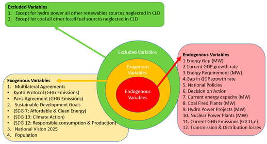The system under consideration is electric power generation in Pakistan with a focus on power generation sources such as coal, hydro, and nuclear energy. National policies and multilateral agreements set targets for GHG emissions and economic growth which are taken as desired goals for the system to achieve. Key variables are elaborated here.