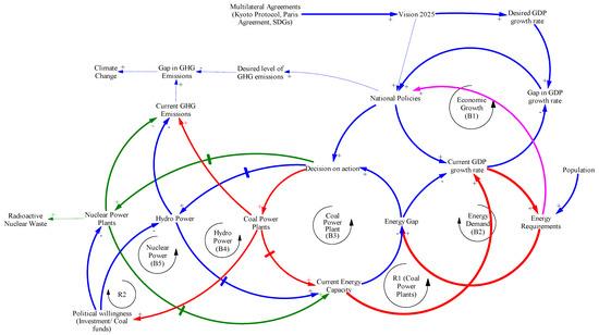 Loop R3 reinforces the efforts for economic growth in loop B1. The variables involved are national policies, current GDP growth rate, and energy requirements. As envisioned in Vision 2025, a GDP growth rate of 7–8% is desired to be sustained by 2030 [14], based on which national policies were developed to align growth in electric power generation. These national policies facilitate economic growth, which in turn increases the energy requirements.