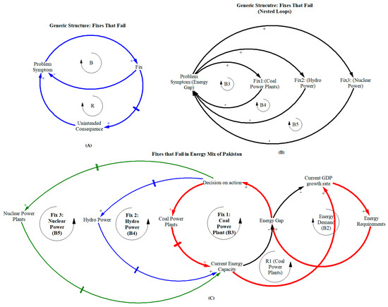 (A) Generic causal loop diagram of fixes that fail. (B) Nested causal loop diagram of fixes that fail. (C) Causal loop diagram of fixes that fail in electric power generation of Pakistan.