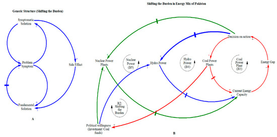 (A) Generic causal loop diagram of shifting the burden. (B) Causal loop diagram of shifting the burden in electric power generation in Pakistan.