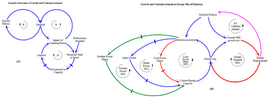 (A) Generic causal loop diagram of growth and under-investment. (B) Causal loop diagram of growth and under-investment in electric power generation in Pakistan.