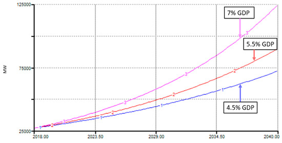 It may be observed from Figure 8 that for a GDP growth rate of 4.5% the energy demand doubled over approximately 15 years and for a GDP growth rate of 5.5% the energy demand may double in approximately 13 years, while for a 7% GDP growth rate, the energy demand may double in 10 years, as compared to 2018. Furthermore, a comparison of the increasing energy demand for various GDP growth rates as shown in Figure 8 indicates the sensitivity of energy demand associated with GDP growth rates, resulting in significantly different doubling periods.