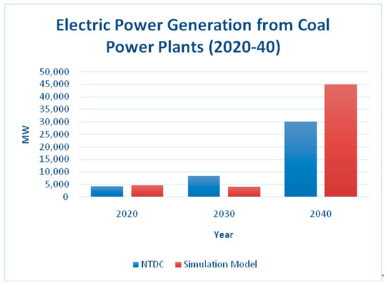 It may be observed from Figure 10 that electric power generation from coal power plants, as forecasted by NTDC, is approximately 8000 MW in 2030 and 30,000 MW in 2040. Our simulation model predicts electric power generation from coal power plants as 4000 MW in 2030 and 45,000 MW in 2040. It may be worthwhile to note here that a non-linear behavior is exhibited by the growth in electric power generation from coal power plants in Pakistan consistent with the systems archetype “fixes that fail”, indicating falling into the vicious cycle of coal.
