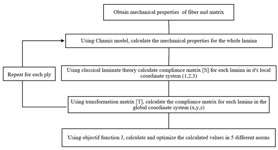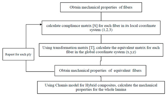 Two new analytical models were proposed to predict the mechanical performance of laminate composites based on Chamis model [25]. The multi-scale modeling strategy was adopted to predict the elastic properties of the composites (Figure 2). The KY analytical model consists totally of three basic steps. Firstly, the elastic performance of constituent components in lamina (or layer), i.e., the fiber and the pure resin matrix, is computed. Secondly, the stiffness matrix of each layer can be obtained by the stiffness-volume-averaging theory. Thirdly, an objective function is implemented to optimize the calculation and to find the optimal solution. Another model was investigated, which consists of finding equivalence of fibers in angle to be in the same direction 0° and to adopt the new fibers into Chamis and Sinclair’s hybrid method [8].