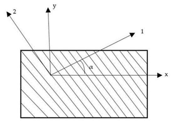 Generally, a laminate does not consist only of unidirectional laminae because of their low stiffness and strength properties in the transverse direction. Therefore, in most laminates, some laminae are placed at an angle (Figure 4) It is thus necessary to develop the stress–strain relationship for an angle lamina. The coordinate system is used for showing an angle lamina. The axes in the 1–2 coordinate system are called the local axes or the material axes. The direction 1 is parallel to the fibers, and the direction 2 is perpendicular to the fibers. In some references, direction 1 is also called the longitudinal direction L, and the direction 2 is called the transverse direction T. The axes in the x–y coordinate system are called the global axes or the off-axes. The angle between the two axes is denoted by angle θ.