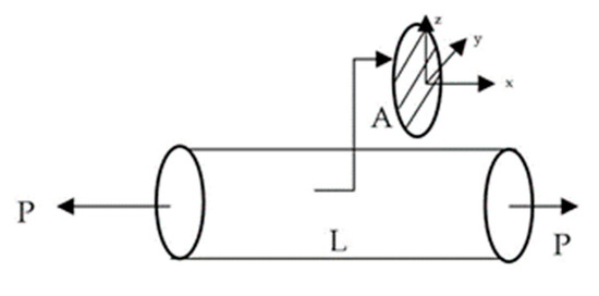 A mechanical structure takes external forces, which act upon a body as surface forces (for example, bending a stick) and body forces (for example, the weight of a standing vertical telephone pole on itself). These forces result in internal forces inside the body. Knowledge of the internal forces at all points in the body is essential because these forces need to be less than the strength of the material used in the structure. Stress, which is defined as the intensity of the load per unit area, determines this knowledge because the strengths of a material are intrinsically known in terms of stress. The determination of stress distributions of beams in necessary for determining the level of performance for the component. In particular, stress-based failure theories require determination of the maximum combined stresses in which the complete stress state must be either measured or calculated. Consider a bar of cross-section A and length L (Figure 8). A uniform tensile load P is applied to the two ends of the rod; by finding the state of stress, and strain energy per unit volume of the body. Assume that the rod is made of a homogeneous isotropic material of Young’s modulus, E. Normal Stress: Having derived the proportionality relation for strain, εx, in the x-direction, the variation of stress, σx