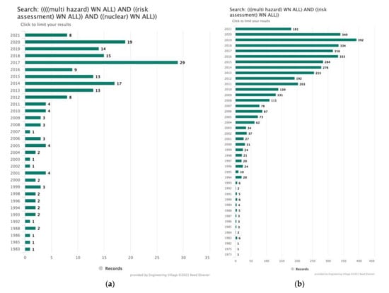 Figure 1 shows the papers published related to the multi-hazard risk assessment between 1983 and 2021, with the given keywords on top of the figures. Figure 1a shows only nuclear-based multi-hazard risk assessment; the figure on the right-hand side (Figure 1b) displays all research based on multi-hazard risk assessment. The interest in the multi-hazard risk assessment tends to increase, especially after the Fukushima NPP accident in March 2011. Moreover, most of the publications on multi-hazards come from the US, leading the published papers with 61 articles. France has 27 articles, Germany, Italy, and Japan have 13 articles each, Canada and the Republic of Korea have 12 articles each, and so on during the same period.