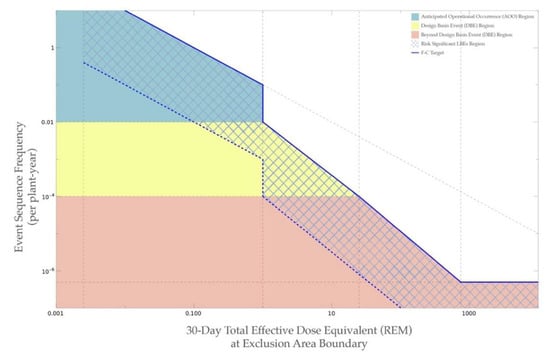 - AOOs are expected to occur with a frequency greater than 10−2/plant-year during the plant’s life, either include single or multiple reactor modules. The F-C Target for high-frequency AOOs until 10−1/plant-year are based on an iso-risk profile defined by annual exposure limits of 10 CFR 20 [49], in other words, 100 mrem/plant-year. The frequencies between 10−1/plant-year and 10−2/plant-year, the F-C Target is set at a reference value of 1 rem by considering the Environmental Protection Agency (EPA) Protective Action Guide (PAG) limits [50].