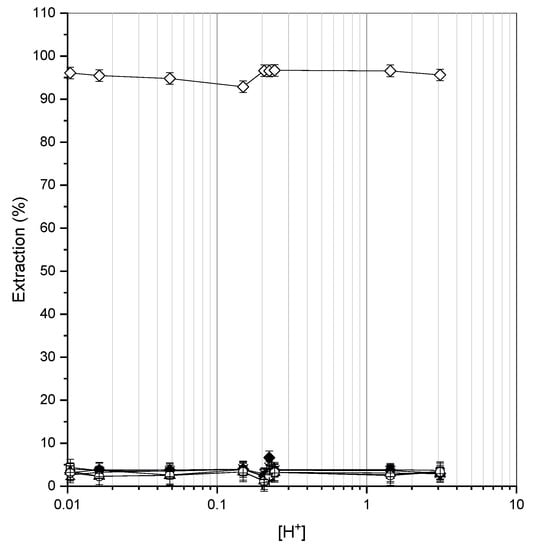 Extraction percentage of metal ions as a function of acid concentration on MTS9140. Al(III) = +, Co(II) = ☐, Cu(II) = ◇, Fe(III) = ◆, Ni(II) = ▲, Mn(II)= ✕, Zn(II) = ⃝.
